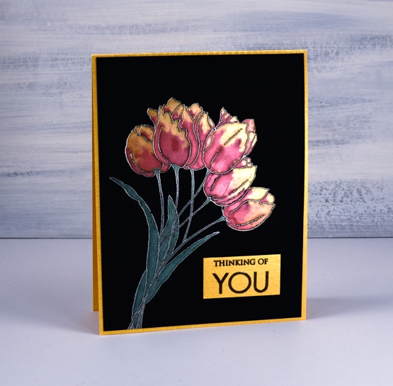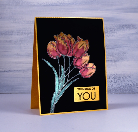 Introductions are necessary, I have a new crafting surface to share with you. Opaque black craft plastic has just been released by Grafix and I found it to be a perfect base for pearlescent paint. It was tricky to photograph but I think you can see the shimmer in the both the paint and the gold card base. Here is a video of my process.