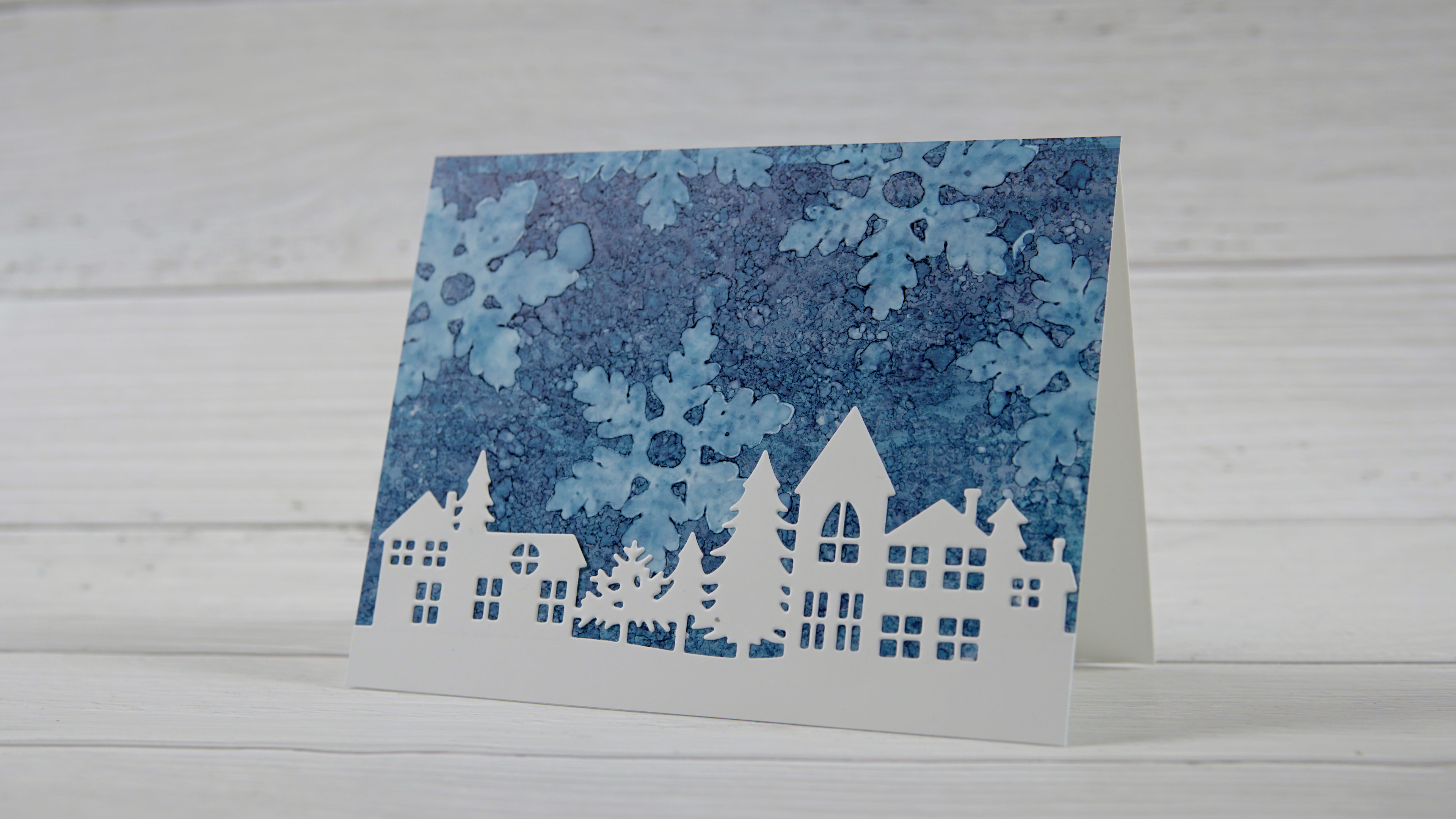 I used stream and denim alcohol inks and felt to apply the inks to the plastic films. To create the snowflake patterns I die-cut a Penny Black snowflake from felt and stuck it to the wooden back from a old stamp. You can see the whole process in the video below.