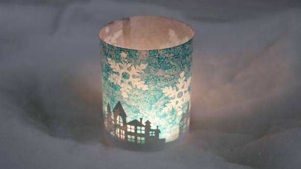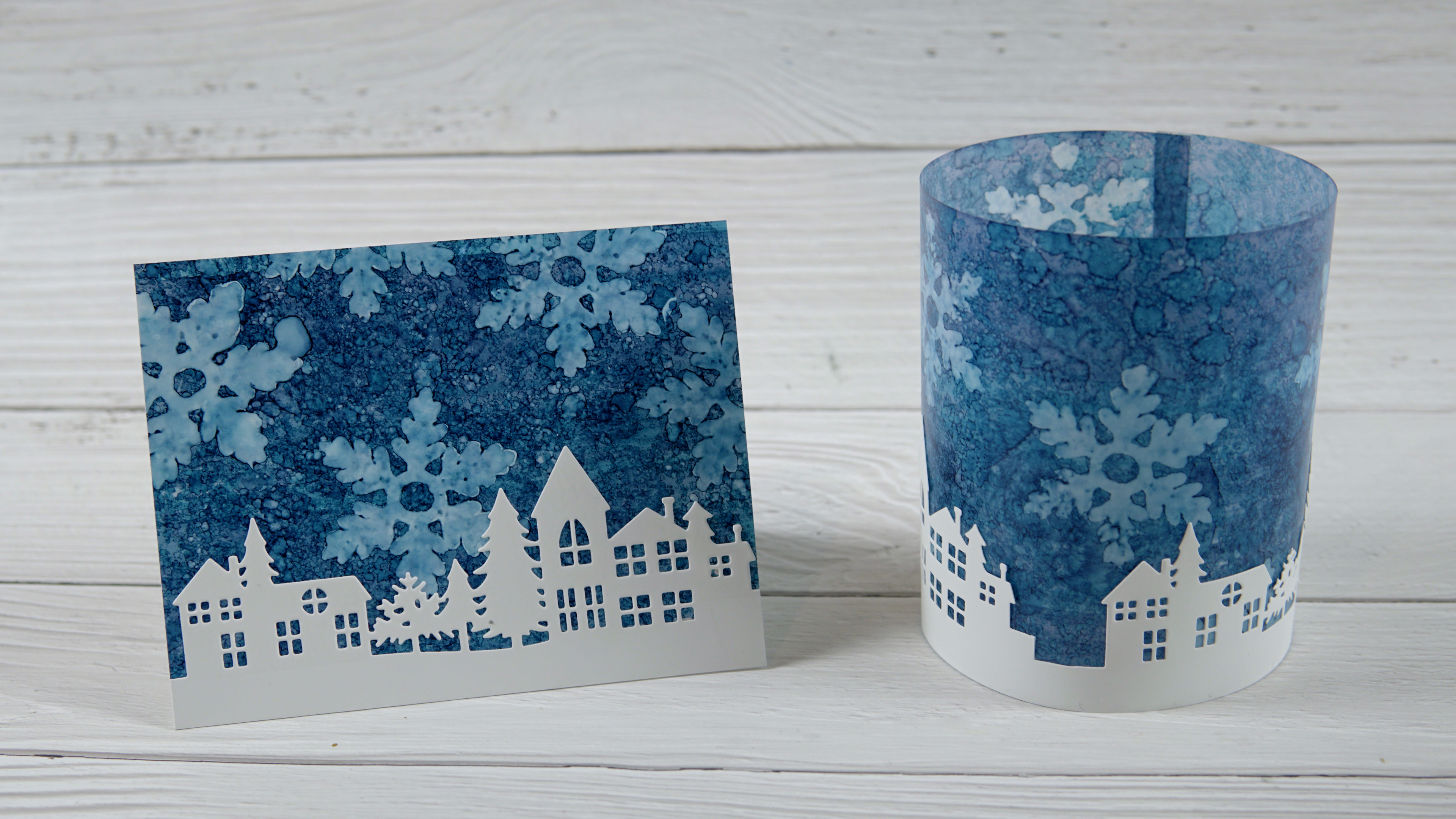 I teamed up with Grafix to create a couple of snowy projects on their Duralar plastic films. The card you see on the left and below was inked on white craft plastic, also know as DuraBright white. It is totally opaque and has a bit of weight to it. For the votive wrap I used Dura-Lar matte film which is lighter weight and has a frosted transparent appearance which was what I wanted so the light from a votive would shine through.