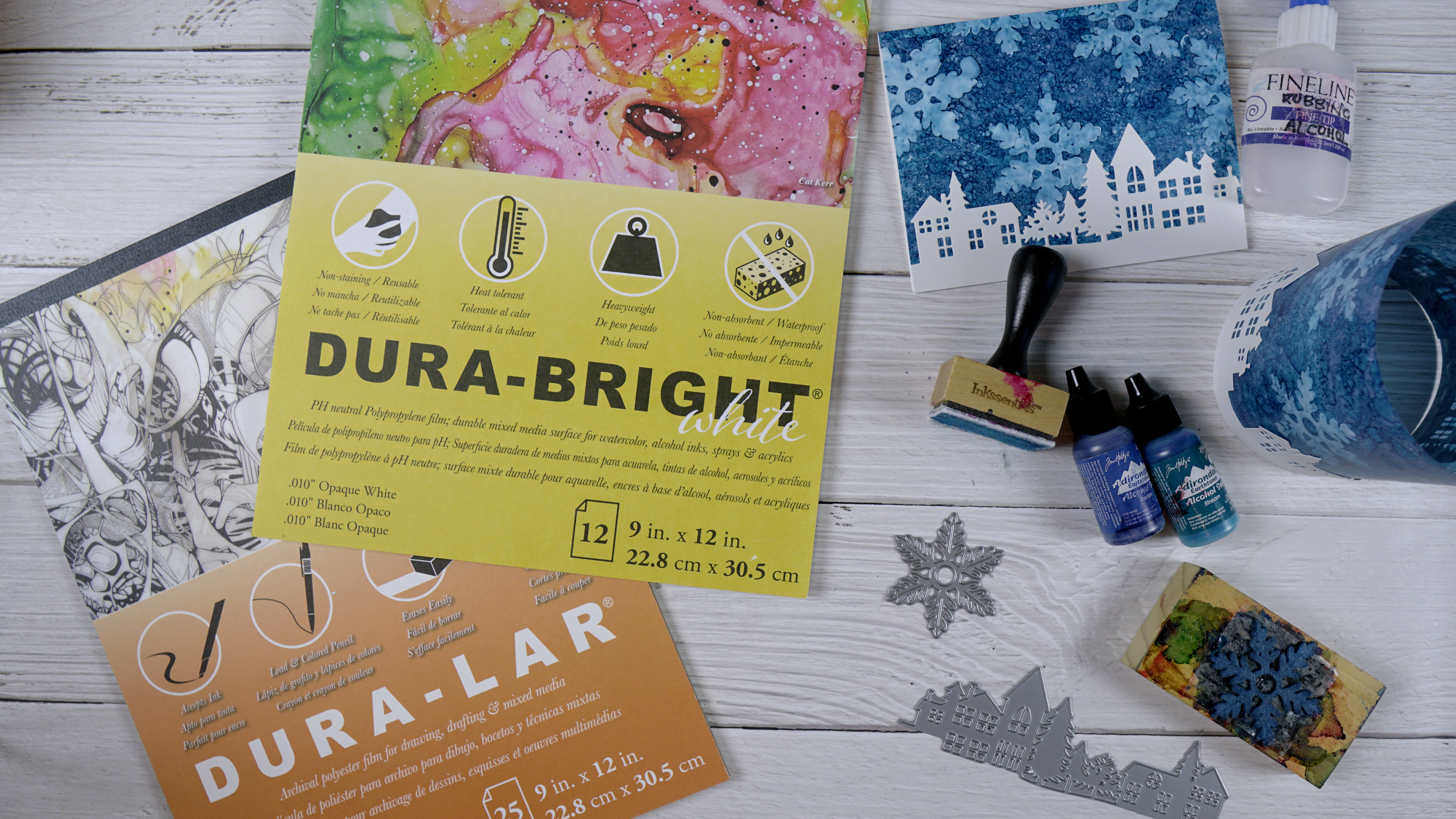 I’m really enjoying working with the Dura-bright white for alcohol ink projects and will be trying more techniques on the Dura-Lar matte in the future. If you are looking for the bright white remember it also goes by the name white craft plastic. Crop A While might have some and Deserres does carry it.