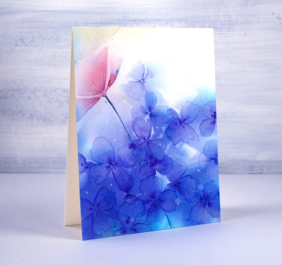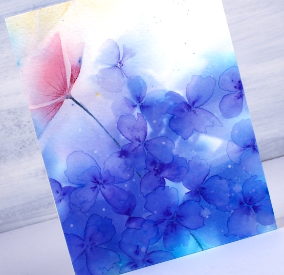 The card above with the purple flowers doesn’t feature any stamping, the patterns made by the cling wrap made me think of a hydrangea flower head so I painted a bunch of little flowers using a purple watercolour pencil to draw centres then a paintbrush and water to blend the pencil into petals. While the petals were still wet I used the pencil again to add some darker areas in the centres.