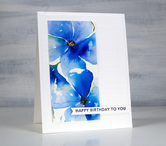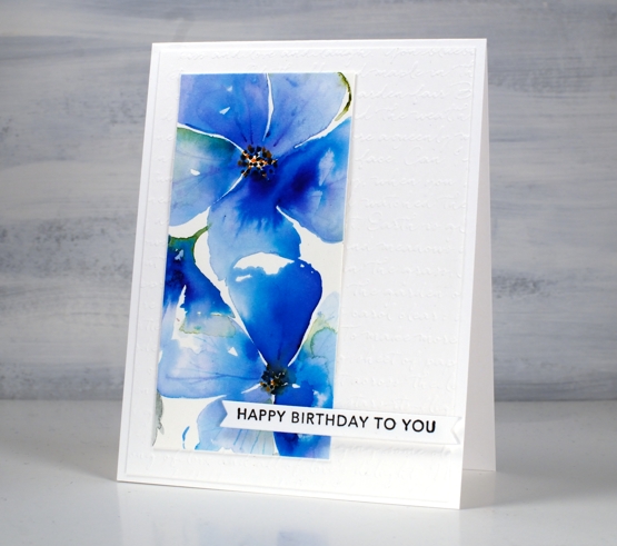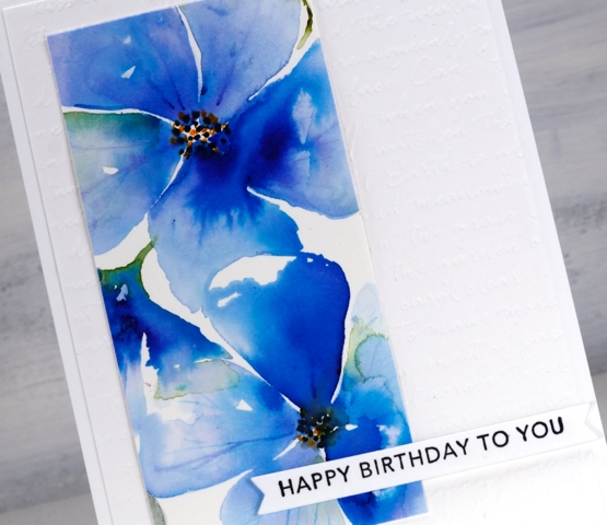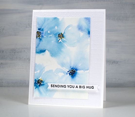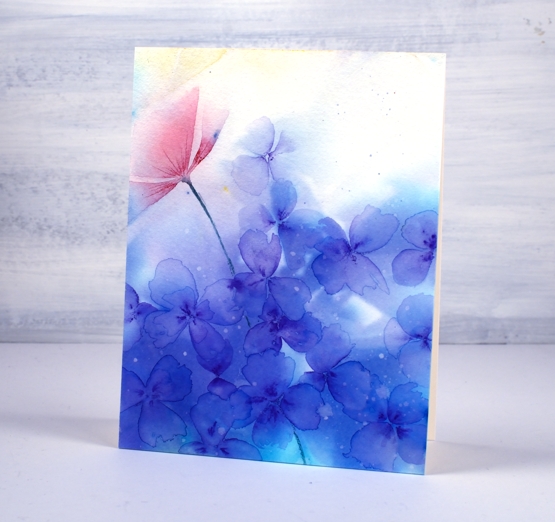 I spent a little while painting florals the other day. My watercolour paints were on my table so I painted two precut card panels with a few blues. I started the flowers on both cards by putting five little dabs of paint in a circle then blending them out with a wet paint brush. After blending I added dots to the centres with black and yellow markers.