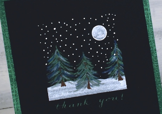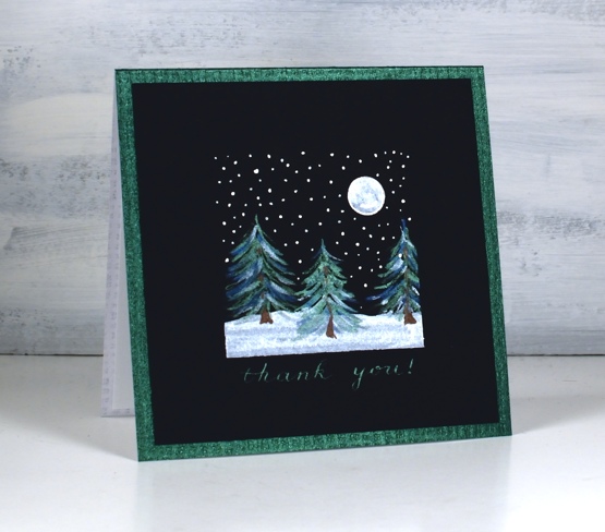 I painted the snowy ground and circle moon first with silver pearl from the Finetec Artist Mica set of 12, then the foliage of the trees with blue green, moss green and midnight blue from the Coliro Ocean set of 6. The tree trunks are chocolate from the Coliro Earth set. I finished by dotting stars over the sky with Sakura gelly roll pens then wrote the words ‘thank you’ with a very fine nib and the same moss green pearlescent paint.