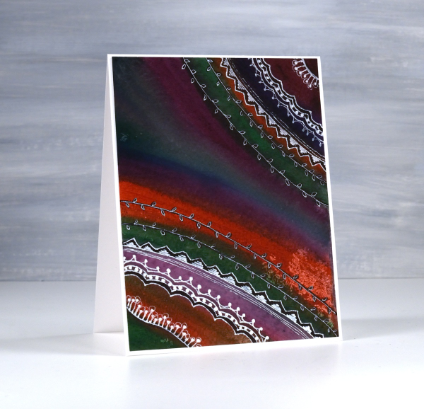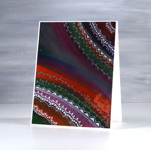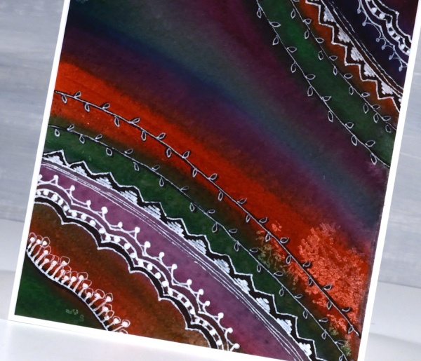 I did most of the doodling with a white gel pen with some black sharpie underneath here and there for more contrast. I have more cards to share made as part of the same class. The watercolour colour mixing part of the process is very relaxing and enjoyable. I haven’t added sentiments to either of these cards but I can add one before sending if I wish.