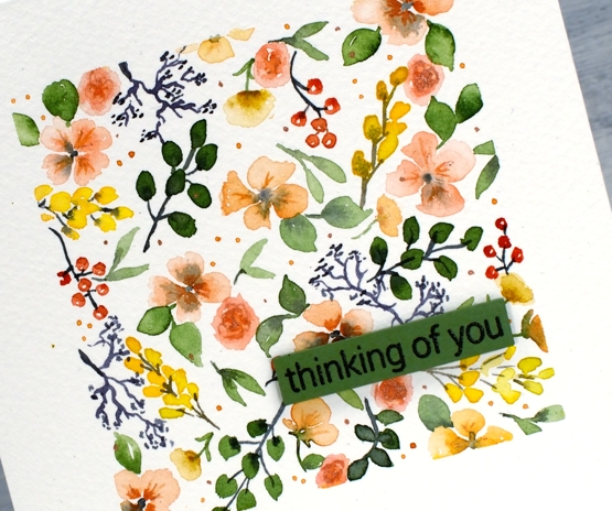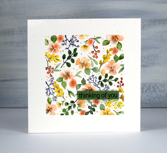 I painted this design on a larger panel and then cropped it to make it look more balanced. I used a rectangle die to choose the part of the panel I wanted but you can do the same with two pieces of ‘L’ shaped cardstock held on opposite sides of a panel and moved to ‘frame’ the design. I popped up my painted panel on foam and my stamped sentiment on one extra piece of cardstock.