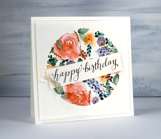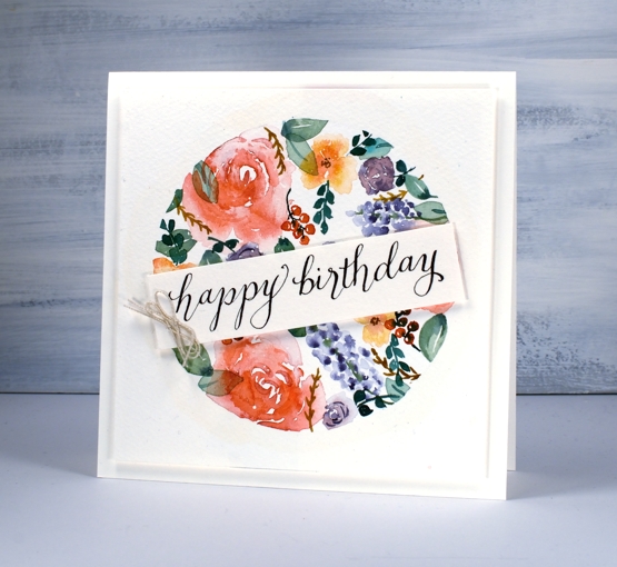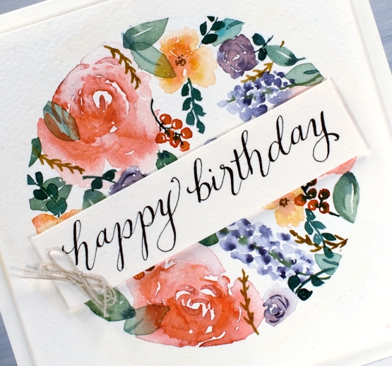 Once the painted circle was complete I practiced a ‘happy birthday’ greeting on scraps of watercolour paper with my nib pen and some black ink until I was happy with the size and style. I had only written 2½ letters before a large blob of black ink landed on the panel where the letter ‘p’ should have been! As you probably guessed that is the reason I have a large birthday banner obscuring some of my pretty flowers.