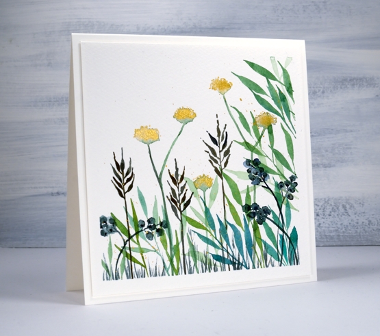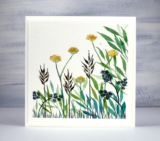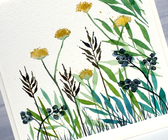 I painted a simple scene recently featuring mainly grasses along with some berries and golden flowers. Unlike some of my other paintings where I have tried to make them look like a particular flower or vegetable, these plants are whimsical doodles.