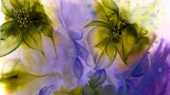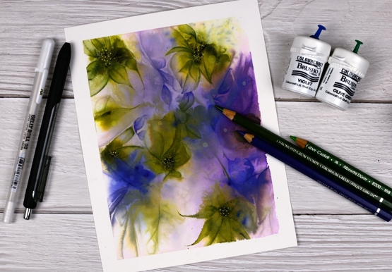 I taped some watercolour paper to my glass mat, wet the whole panel then scattered brusho over it. I just used two colours of brusho, olive green and violet and I tried to keep them a bit separate. I spritzed the panel lightly to keep the paint moving then lay a piece of cling wrap over the panel and scrunched it over the whole area. The wet paint sticks to the clink wrap creating coloured areas. Where the cling wrap is raised and bunched together there are gaps in the paint. It’s hard to explain but CeeCee’s video gives you the idea. The covered panel takes a long time to dry but once it has you remove the cling wrap to reveal intersecting lines and spaces. I studied my panel and instead of the purple flowers with green leaves I was hoping to see I saw the suggestions of green flowers and purple ‘things’. The idea is to enhance the lines and patterns made by the cling wrap rather than draw whole new patterns. I wish I had taken a photo before I did any colouring that would have given you a better idea.