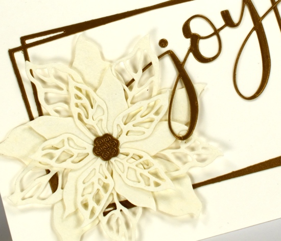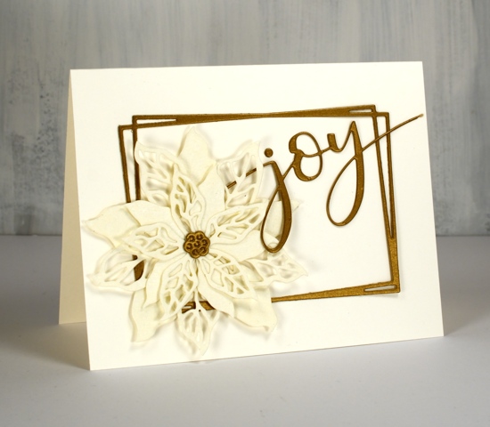 The second card features the same cardstocks but a new PB poinsettia stamp ‘scarlet season’ which has both solid and filigree flowers. I cut them once again from the lacy cardstock and layered them over a funky rectangle die from ‘Ink to Paper’ and added the PB ‘joy’.