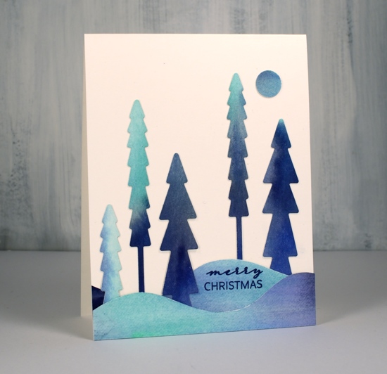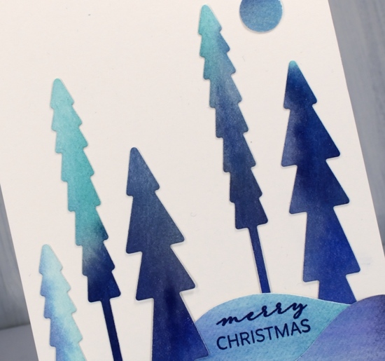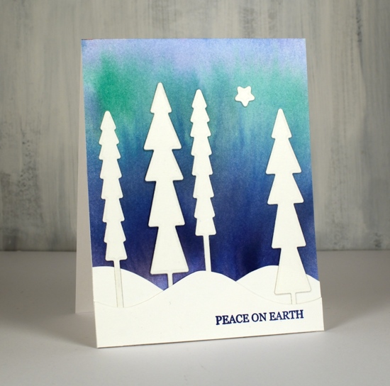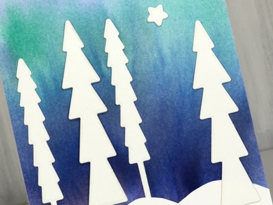 As I mentioned the other day every year I create new snowy forest scenes, often then include starry skies or the northern lights. This first card features a very easy way to make a ‘northern lights’ background for die cut trees, houses, reindeer, etc.