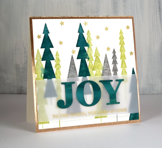I wanted the die-cut letters to match the trees exactly so I swiped ink across a scrap of watercolour paper then blended it with a wet brush. Once dry I used the ‘season of joy’ dies to cut the word and a stamp from the ‘season of joy’ stamp set to complete the first line of the carol. I used two layers of vellum so the letters and embossed words would stand out from the busy background. I added gold embossed stars and created a textured gold card base from Tonic cinnamon silk specialty cardstock.