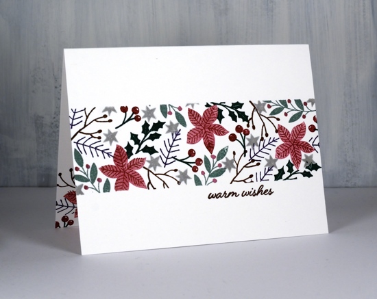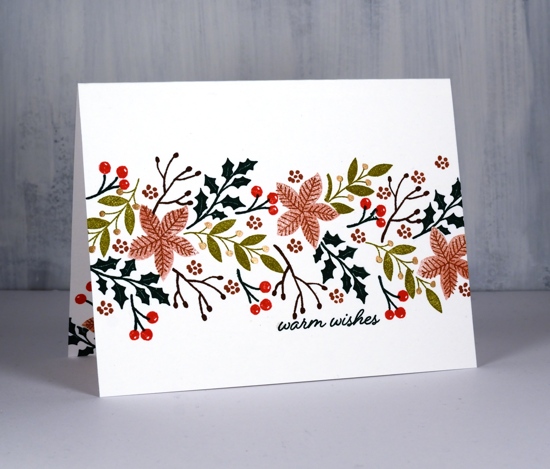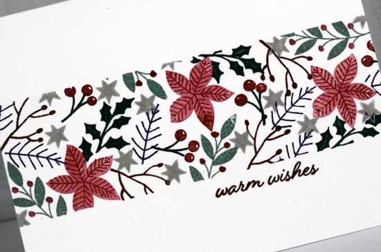 I worked on these two cards side by side on my glass mat. I taped the second one down with post-it tape using the grid on my mat to get the tapes lined up so they would mask off a band across the card front. On this first card I just taped down a couple of corners to keep the card steady. The only time I used my stamp positioner was to add the sentiments at the end. For the card above and close up below I used an earthy colour scheme of greens, brown, red and pops of gold. I used Papertrey ink cubes ripe avocado, pine feather, dark chocolate, Americana and distress barn door. It made sense to start with the poinsettias as they were the biggest, next the larger leaf sprays and finished with the berries and little flowers. I added finetec gold paint over the berries on the green leaf sprays to add some shimmer and make the berries stand out. There are matching dies for these sets so I cut a poinsettia shape from a post-it note to do a little masking when I wanted to pop leaves behind.