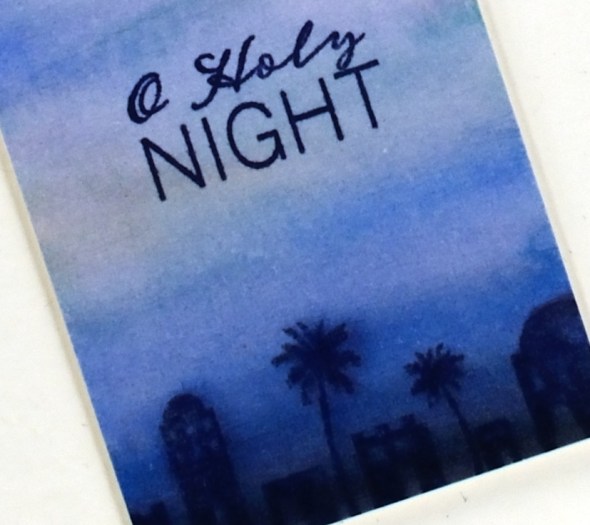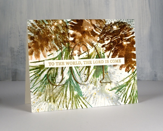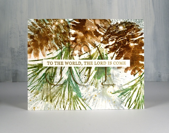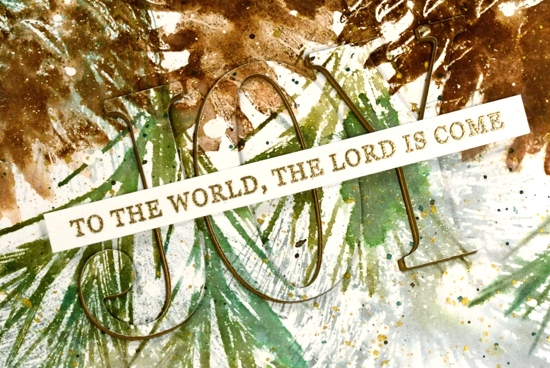 I stamped the rest of the Christmas carol lyric using a stamp from Ink to Paper’s ‘season of joy’ set and some gold embossing powder. The overall pattern may be a little messy but it reminds me of what I see if I look up into the branches of the very messy pine tree in my front yard, which is currently covered with snow but not gold splatter!