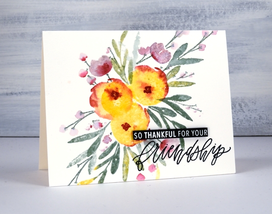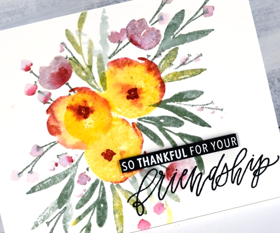To add leaves and small flowers I masked the three centre flowers with a post-it note and stamped stems and leaves to look like they were poking out from behind the yellow flowers. The leaves and stems are stamped in ‘ocean tide’ and ‘pinefeather’, the small flowers in ‘winter wisteria’ and ‘scarlet jewel’. I spritzed before stamping each time so I would get a softened look. The sentiment is from the same set; the large word is stamped in nocturne and embossed in clear, the smaller words are embossed in white on black cardstock and popped up.