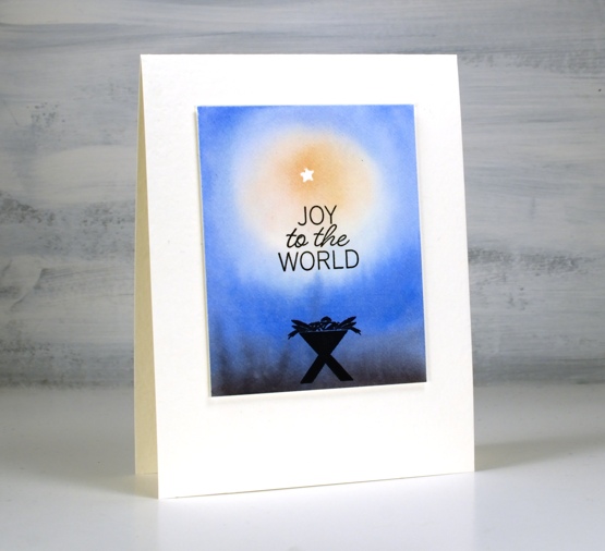 The tiny star was masked by die cutting a star (PB Xmas tree border set) from frog tape (painter’s tape for delicate surfaces) then positioning it firmly on the panel before painting. I stamped the manger above in versafine clair nocturne once the panel was totally dry.