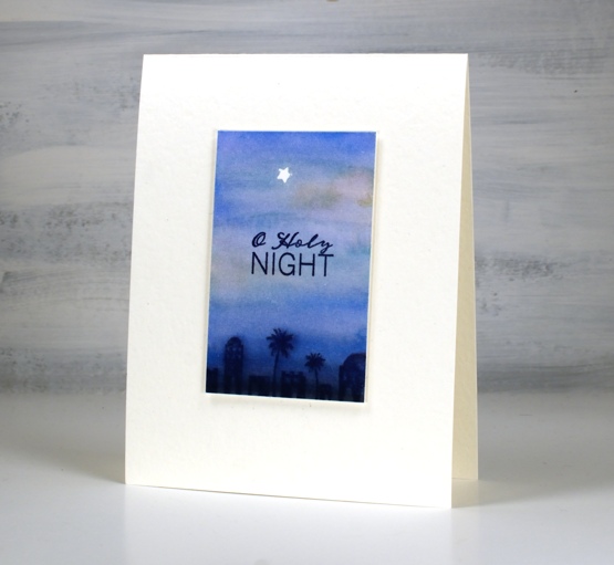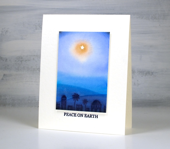 To get a soft image of the Bethlehem stamp I stamped it in chipped sapphire distress ink while the background was still slightly wet. On the panel above I took a wet paint brush and painted a hill shape across the lower part of the panel waited then painted another one even lower down. I didn’t need to add any ink the paint brush just dragged ink from the Bethlehem image. I popped up each panel with two pieces of cardstock, attached it to a white luxe card base then added sentiments from the Ink to Paper Be Merry Mini set.