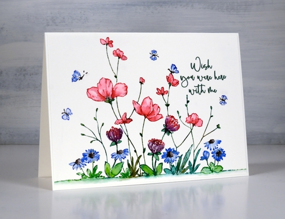 I used the following markers; magenta, lush green, henna, lilac, black, royal blue varying the greens with the help of the ‘henna’ marker to add more yellow tone. The stamp is a large one but I extended the edge of the ground even more with a few dots and dashes of green marker blended underneath with water. I kept this card design very clean with plenty of white space, the only added texture being the subtle border of the painted panel over a slightly larger card base in the same colour. I just felt the pretty colours were enough. To see a different look with the same stamp check out this card.