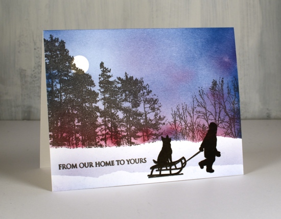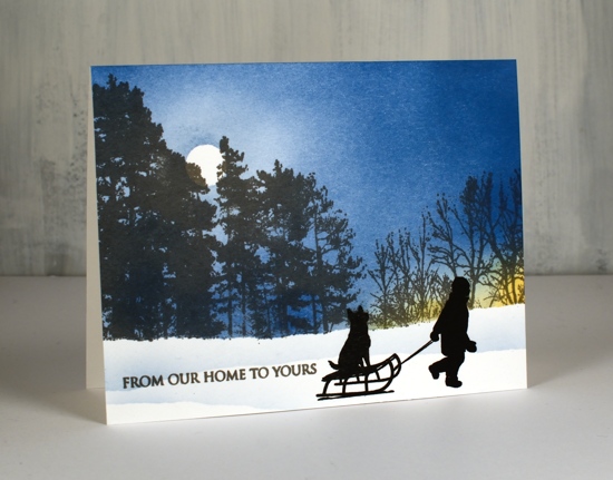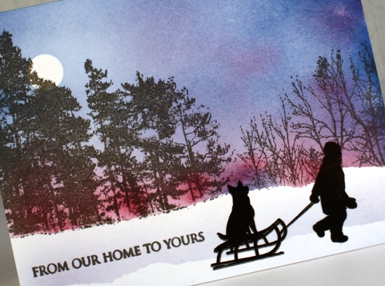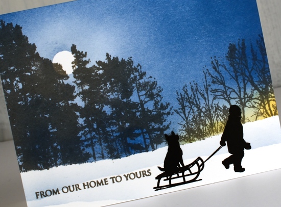 Both these cards were made on smooth bright white bristol cardstock which shows off the detail of the tree stamp beautifully. I made an improvement the second time I made this card so I will share my ‘better method’ with you here. I suggest stamping and embossing the child and sled first, that way any inking and blending done after will be resisted because of the embossing. When I tried just stamping in black after blending the sky there was a difference in the blackness of the child image because of the blended ink underneath.