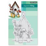 One thing I did which worked in my favour was limit my colour palette. I mixed colours I had already used rather than continually adding new ones. This helps with the cohesiveness of the finished panel. I started by stamping the ‘aviary’ stamp on hot pressed watercolour paper in versafine smokey grey. I painted the area surrounding the birdhouse first with blue and green paint. I kept it mainly blue and used a ‘wet into wet’ method, painting around edges first with water then adding paint. A medium sized brush that comes to a good point can help with this as there is a lot of space to cover but also some tricky areas to navigate. Also if your brush is too small or doesn’t hold liquid well you will be forever picking up more water or paint.