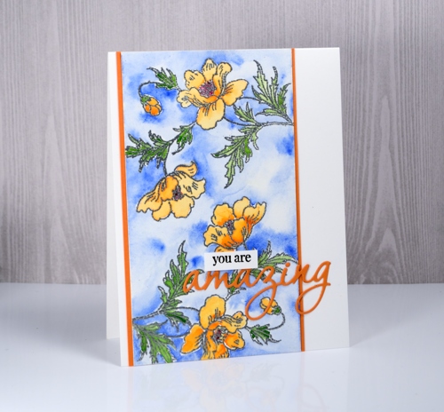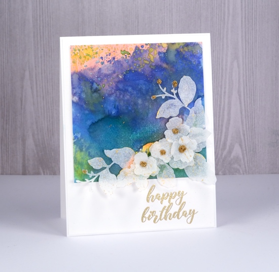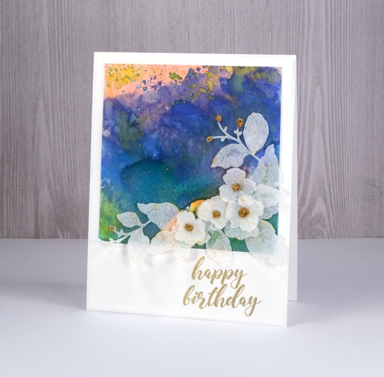 The orange and yellow card was done in a similar fashion but I used colorburst powders and added some yellow gold liquid metal when I added water. There is a shimmery patch of colour as well as specks of gold in real life.