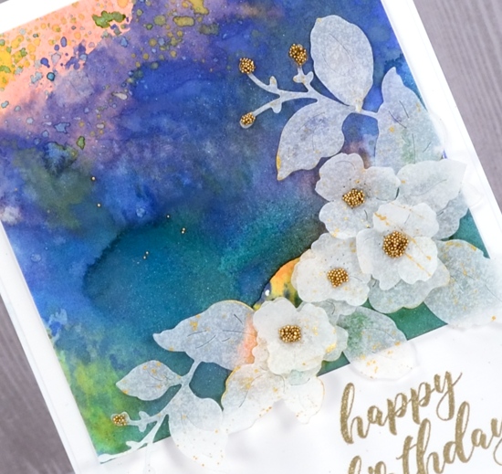 To create my spray of flowers I used the Penny Black ‘floral arrangement’ die to cut three flower sprays from ‘parchment’ patterned vellum, one of the designs in the grafix assorted vellum pad. I snipped the die cut flowers to create a layered arrangement of small flowers and leaves. The die does cut a larger flower, but I didn’t use it on this card. I put all my die cuts in a box and splattered gold paint from the gansai tambi starry colors set over them. After they dried I attached the leaves and flowers on my panel and I added a drop of glue to some of the flowers and sprinkled gold micro beads onto the glue. I co-ordinated the sentiment with the beads by embossing it in gold. All the supplies are listed below.