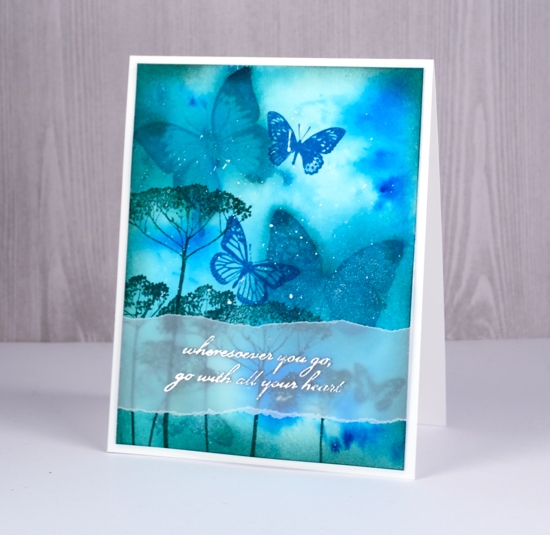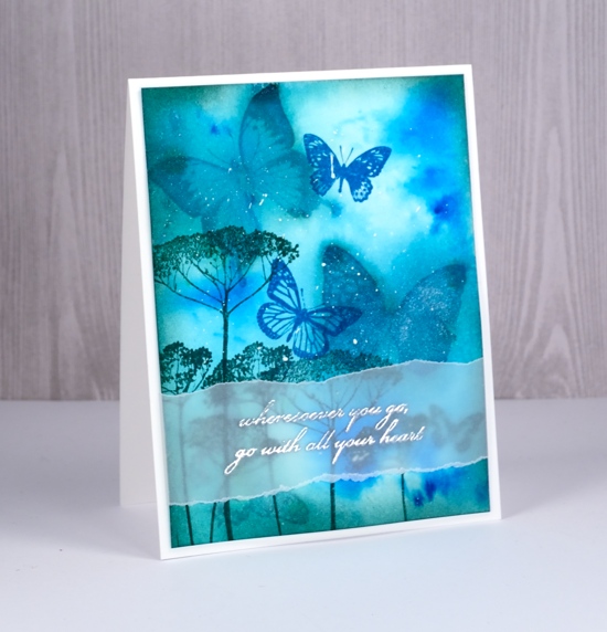 I used pine needles and mermaid lagoon distress inks to stamp foreground images, more butterflies and some flowers. I framed the panel by sponging pine needles ink around the edges then splattered a little white gesso over it. As often happens with my cards I started thinking about a sentiment once there was no room left for one. Vellum to the rescue with an phrase embossed in silver.