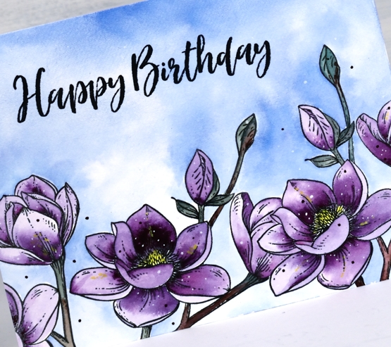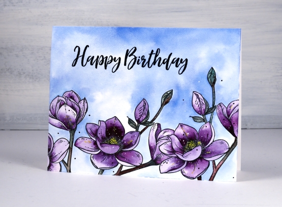 I have teamed up with the Foiled Fox again to bring you these pretty purple blooms made with My Favorite Things, ‘magnolia blossoms’ stamp set. The set contains two stamps; I have used one, stamped three times. To hide one bloom behind another I stamped a mask first on masking paper. I worked on hot pressed watercolour paper, stamped in versafine clair nocturne and embossed in clear powder.
