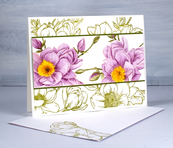 This is a card which changed shape and style several times before it turned into the design you see above. The watercoloured flowers and the green stamped flowers are from the same MFT ‘magnolia blossoms’ set.