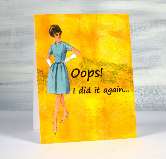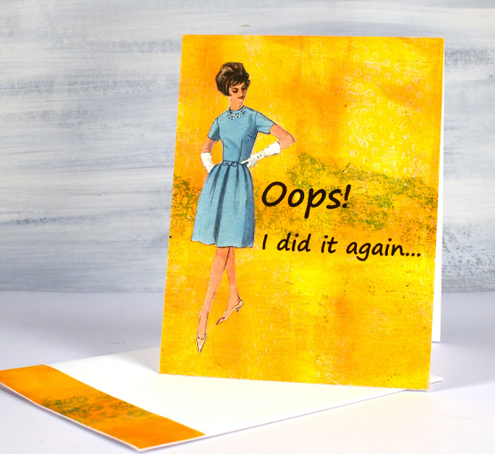 Combining vintage pictures or photos with gel prints on a card is an idea I got from my friend Betty. She has made many clever cards using the same combo. Now that I have made one of my own I’m going to have to do it again, hopefully not due to a missed birthday!