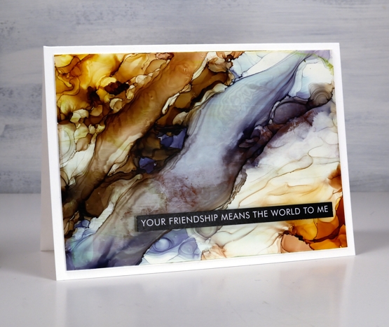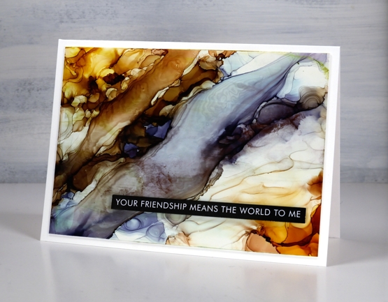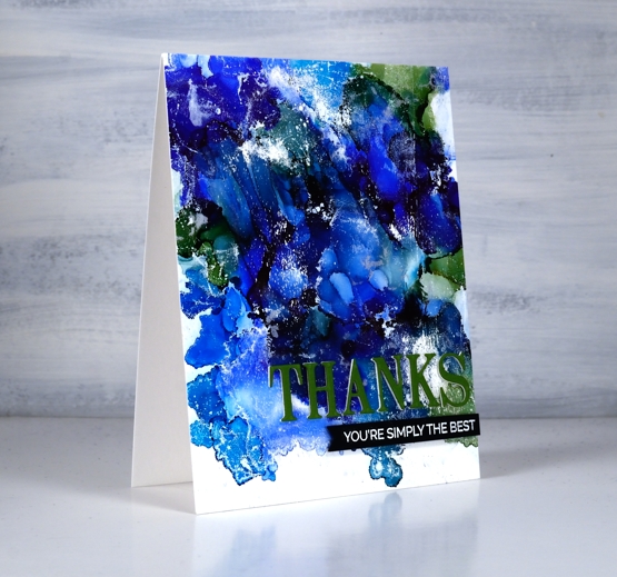 I’ve had the alcohol inks out recently and spent some time trying to get soft wavy patterns on craft plastic. I have seen several artists who do this technique beautifully but I am very much still a beginner with it. I have a few cards to share today along with a video showing my process for two of the panels. I worked on white craft plastic from Grafix which is heavyweight and totally opaque. For most of the panels featured today I used only two alcohol inks plus plenty of 99% rubbing alcohol; each panel was created with a metallic and a non-metallic ink.