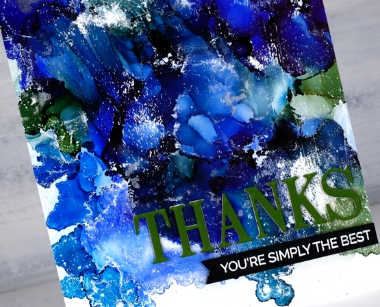 There are several ways to use a stencil with alcohol inks and this is just one. Make sure you check out Ardyth’s youtube channel for more ideas. I mentioned in the video that some alcohol inks tend to be a bit pushy and end up taking over a colour scheme. The lime green did so on this card but I’m glad there are some blues tones still visible at the base of the card.
