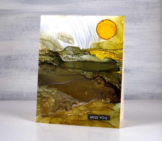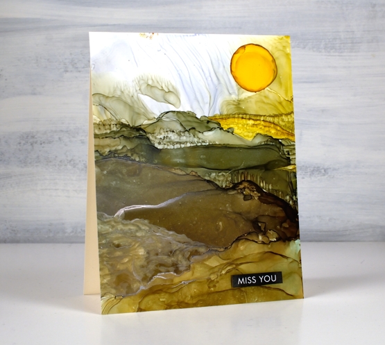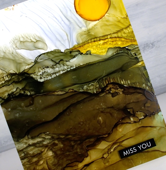 To add the look of trees and crops I used an alcohol ink paint brush and a very small amount of alcohol ink or isopropyl alcohol. I wanted to add texture to the ink that was already there rather than add more ink because when you add more ink it tends to displace the ink you already have on the panel. With this in mind I added a drop of sunshine yellow at the end to be the sun. It did not expand neatly in a circle so I used a paint brush which meant the sun was a bit larger than intended! I finished both cards with sentiments from the Paper Rose Studio ‘so extra supporting sentiments’ pack.