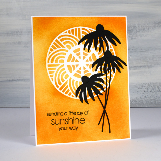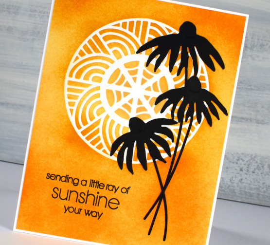 I blended three distress inks through the stencil onto neenah solar white cardstock then added the PB delicate daisies die-cuts and a PB sentiment.