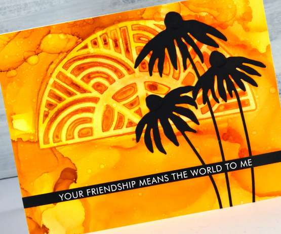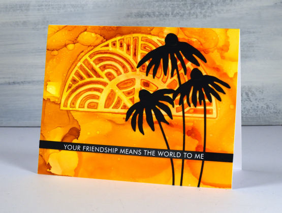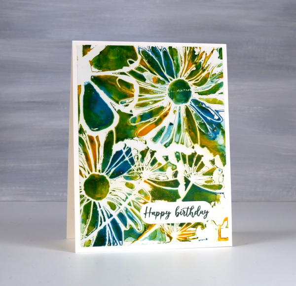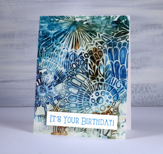 I think you’ve noticed my love of gel printing. Let me assure you it hasn’t diminished at all. Today’s card features an alcohol ink and stencil print completed on the gel plate then lifted with a layer of acrylic paint.