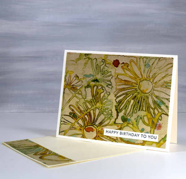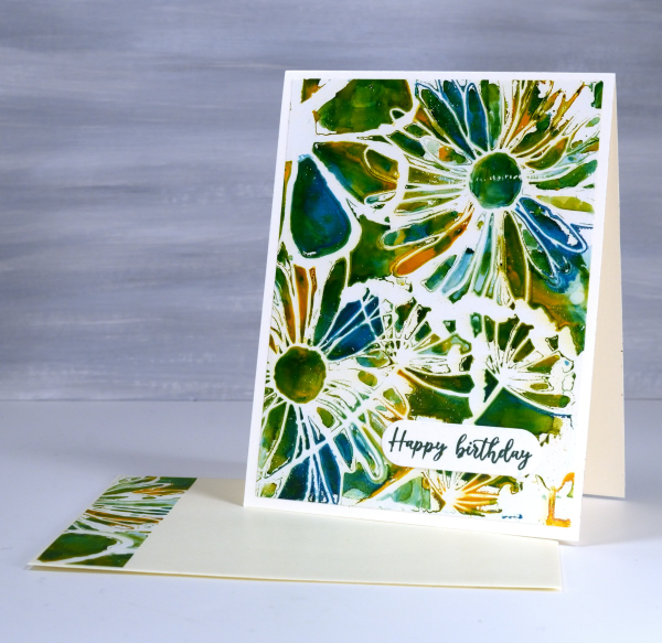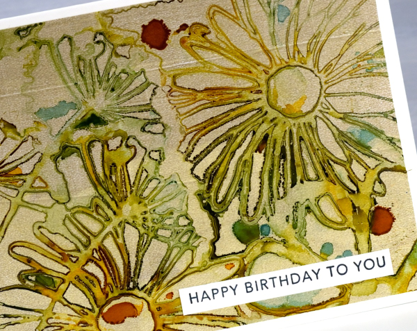I can’t remember exactly which inks I used but I imagine there was a blue and yellow alcohol ink involved and perhaps ‘stream’ which is a deep teal colour. I sprinkled them on the gel plate, added some isopropyl alcohol to get the colours moving and then used a homemade stamp to add the flower shapes. In my online gel printing course I have a whole lesson about making and using homemade stamps with acrylic paints. Using them with alcohol inks is also an option as shown on this card. The speckled look over the panel is from adding a spritz of isopropyl alcohol to the plate before letting it dry.