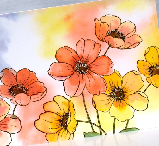 Before I stamped I smooshed distress inks on a glass mat, diluted them and swiped my watercolour panel through the ink to create a soft blurry background. Once the panel dried I stamped in archival ground espresso ink then painted the flowers with the same inks I had used in the background, abandoned coral and fossilized amber. To make the flowers bolder so they would stand out from the background I painted another layer of ink then added deeper colours to part of each petal. All the inks are listed and linked below.