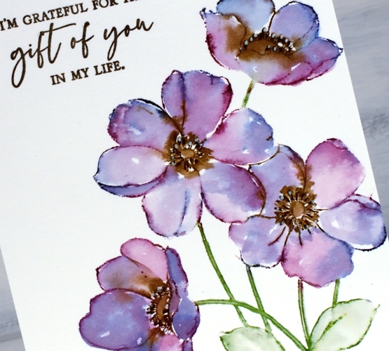 I painted the centres in ground espresso distress ink then used brown and black markers to go over the flower centre details and add more veins to the petals. I added highlights with a white gel pen and once again decided against a sentiment for now.