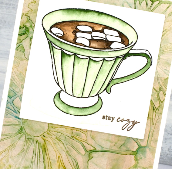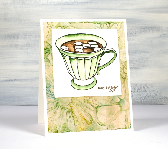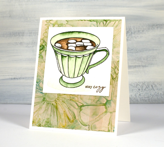 ‘Tis the season for sitting by the fire, drinking hot chocolate and staying cosy. Since I last posted we have had snow, rain, ice and more snow! To create today’s card I paired a watercoloured Echidna Studios image with a alcohol ink gel print. I printed the cup from the ‘tea set‘ digital stamp set on hot pressed watercolour paper then painted it with Sennelier watercolour paints.