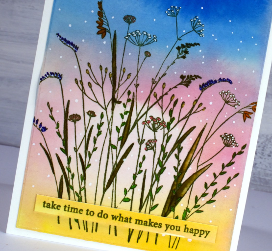I stamped the Penny Black ‘meadow’ stamp on the panel with peeled paint archival ink then coloured inside the leaves with zig clean color real brush markers. I added spots and dots to the flowers and sky with gel pens, a white, a gold and a copper.
