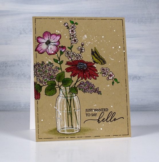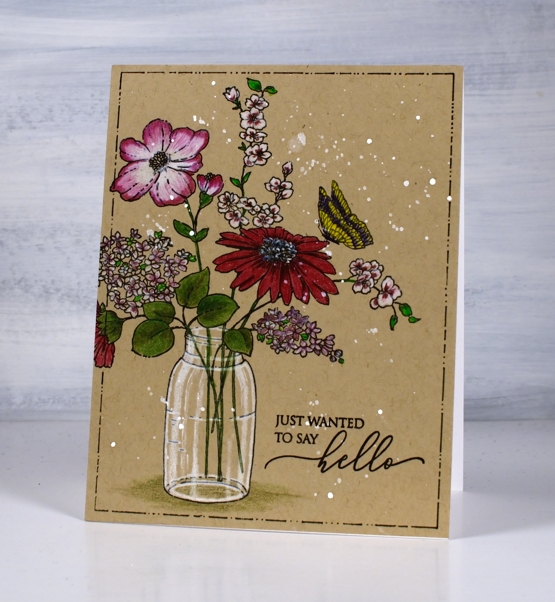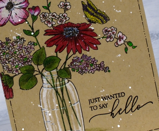 I’m really enjoying pencil on kraft cardstock right now; the colours pop more than you might think on a brown base. This line image from Penny Black is called ‘sweet centerpiece’, cardstock is Bazzill kraft and the pencils are Derwent inktense.