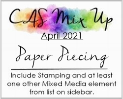 The sentiment is from the same set, stamped in the same ink. To add rain I taped the panel onto my glass mat and positioned a piece of post it tape along the top edge to mask as I ruled lines with a fine white gelly roll pen. Taping the panel to my glass mat and using a t-tuler made the rain pretty straightforward. As I mentioned at the top of the post I’m entering the CAS mix up challenge with this one.