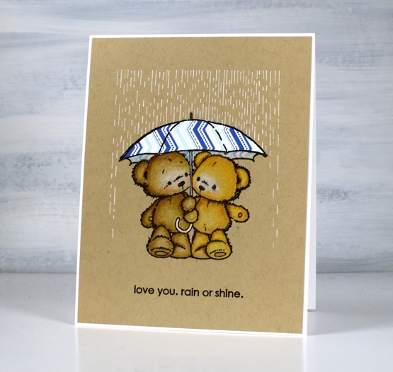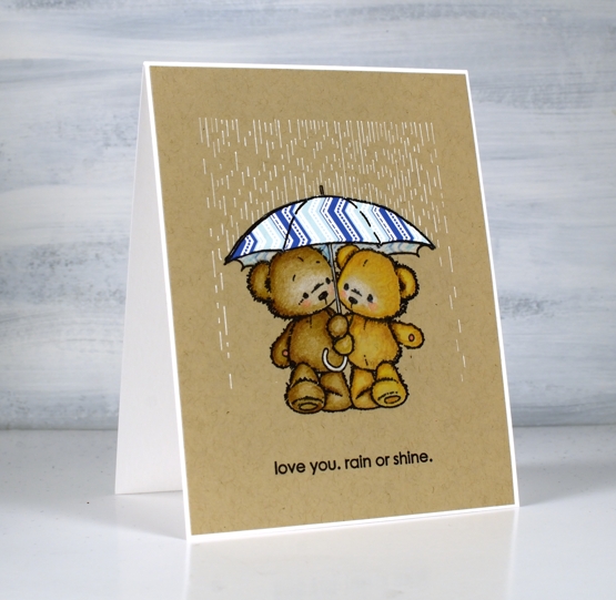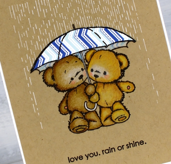 I stamped the PB ‘rain or shine’ stamp on kraft cardstock and Madison patterned paper in jet black archival ink. I started cutting the umbrella out of the patterned paper and realised my (lack of) fussy cutting skills would not do a good job of cutting around the bear’s heads. Instead I cut just the front of the umbrella out and coloured the stamped inside part of the umbrella with a white, a blue and a pale blue pencil. I used two browns for the bear on the left and the lighter brown plus a mustard for the bear on the right. A little pink and white on the faces and I completed my first pencil coloured PB bears!! Do you think cute might be a new direction for me 😉
