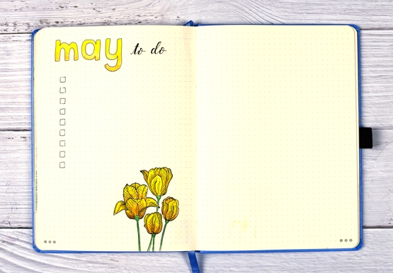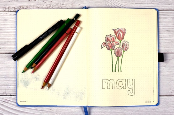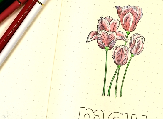 It’s been a while since the last bullet journal feature. I gave the journal a break over April; I was in recovery and catch up mode. We have skipped to May which is the month of the tulip festival in Ottawa so the theme was an easy pick. Coloured pencils seemed to make sense too as I have been working with them a bit lately.