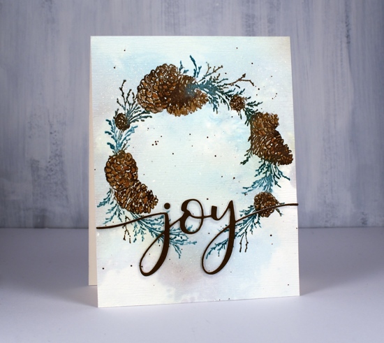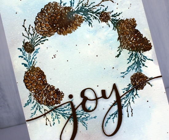 To add a little snow to the pine cones I used a white gel pen then splattered some green and brown ink around the wreaths. Once all the ink was dry I removed the masking fluid then added some texture to the panel with the clever SU embossing folder ‘subtle’.