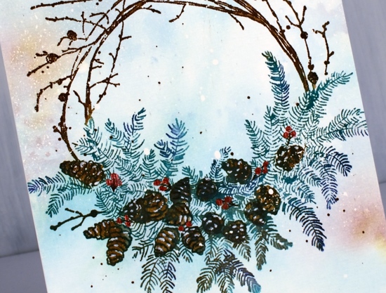 Once the background ink dried I used the stamp positioner to stamp the wreaths colour by colour using pine needles and forest moss distress inks for the foliage, gathered twigs and black soot for the twigs and pine cones and chipped sapphire for some added depth. I drew a few berries on the wreath below with a festive berries marker then painted over them with red from the finetec pearlescent paint set.