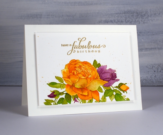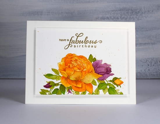 I splattered some gold paint from the gansai tambi starry set over the panel and added a sentiment in gold embossing powder to match. Rather than add a coloured mat I created a subtle ‘shadow mat’ by popping up the panel on a piece of foam. Thanks for dropping by today; let me know if you can see the mistake I made with the rose but decided to just ignore because I definitely did not want to start again!