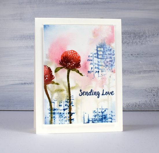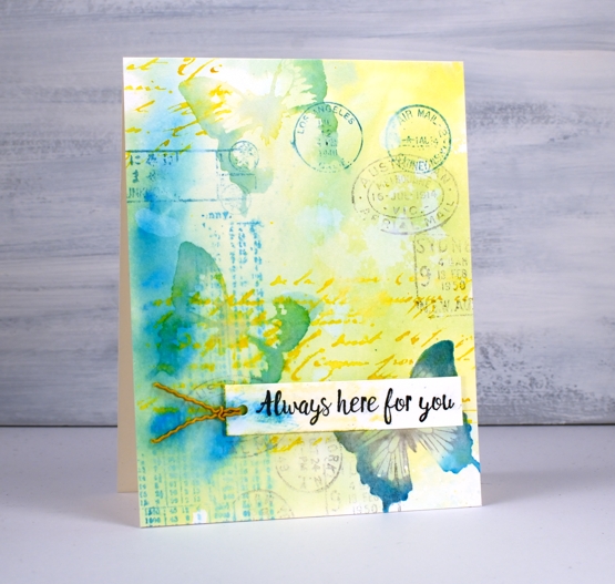 Posted: March 13, 2020 Filed under: Darkroom Door, French Script, global postmarks, number medley, warm wishes, Wings | Tags: Darkroom Door stamps, Ranger Distress inks, Ranger Distress stains 4 CommentsI started today’s card by creating a colourful watery background with distress stains smooshed on my glass mat. ( I am still using up my distress stain daubers but the spray stains will work just as well). I let the panel dry then added some water droplets which sat for thirty seconds before I dabbed them off with a paper towel to create pale watermarks.