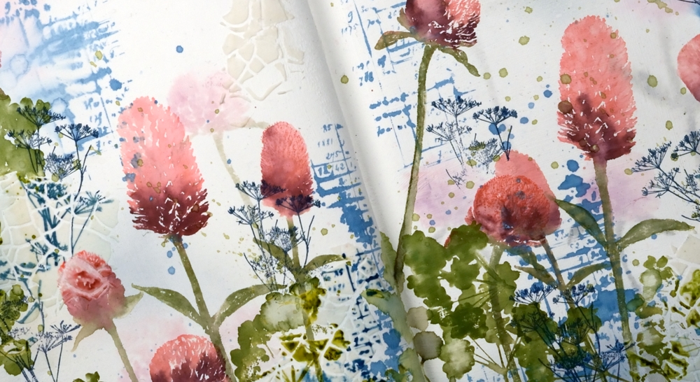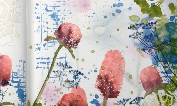 I kept my colour scheme with the addition of more green and added a few extra stamp images and a bit of texture. I used a Fabriano ‘Venezia’ art journal, with drawing paper not watercolour paper. The weight of the paper is decent but if I’m going to be spritzing and adding water and ink I paint a layer of absorbant ground on both pages first.