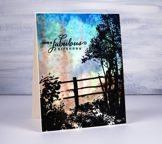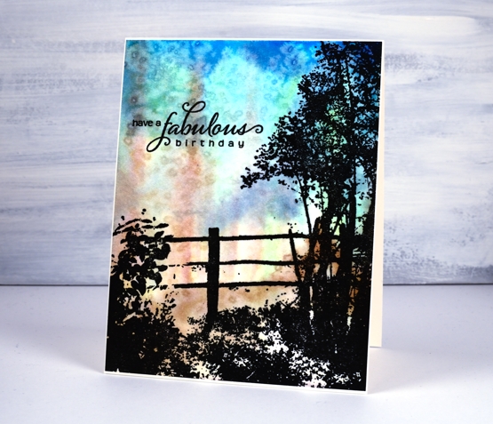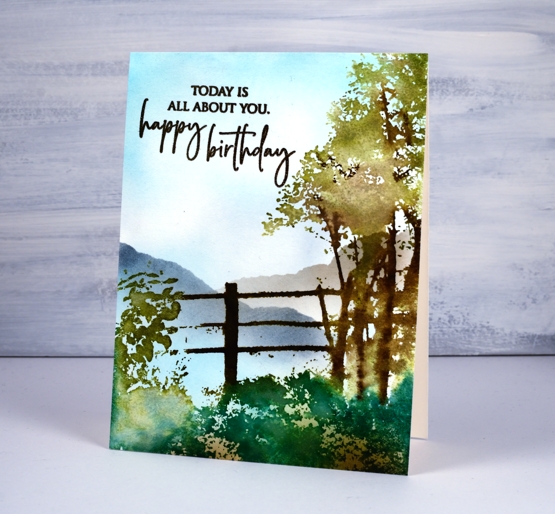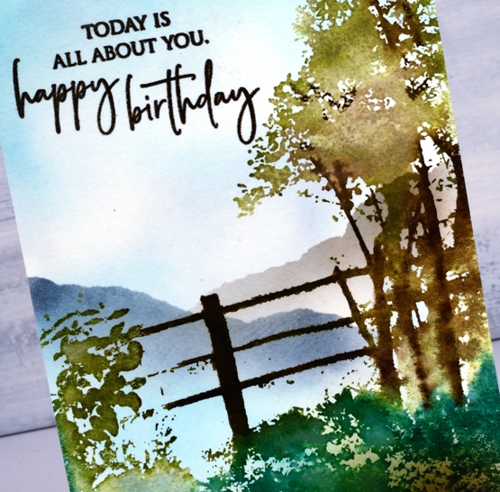 Posted: March 2, 2020 Filed under: beloved view, Penny Black, Stamped Landscapes | Tags: Fabriano Watercolour Paper, Penny Black stamps, Ranger Distress inks, Ranger Distress stains 8 CommentsI haven’t done scenic stamping for a while so ‘beloved view’ from Penny Black called out to me. I decided to stamp it two ways, that way you can see the versatility and I will have two more birthday cards. To begin I smooshed some mermaid lagoon and weathered wood distress inks on a glass mat, diluted the ink with water then swiped the watercolour paper through the inks to create the look of a cloudy sky. I dried the panel then put it in a stamp positioner so I could build up the scene a colour at a time. First I inked the fence in gathered twigs and ground espresso distress inks then, after stamping, blended the browns with a brush and water. Next I inked the foliage of the tree in peeled paint and forest moss inks, spritzed and stamped. I let that dry a little then used a brown marker to ink some of the branches before stamping again. For the foreground foliage I used a mix of pine needles distress ink along with peeled paint. I did a bit more blending with a paint brush then dried the whole panel.