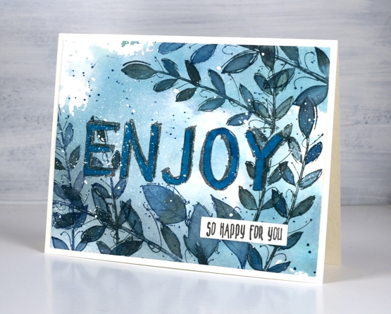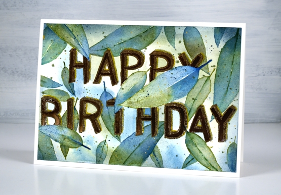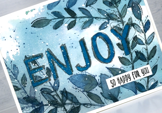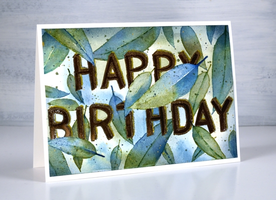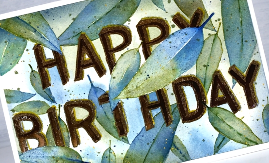 I’ve been creating with Darkroom Door products over the weekend including the new ‘sketched alphabet’ set. I thought the sketched letters looked a bit like pieces of wood which set me thinking about branches and leaves, which made me think of the eucalyptus leaves in the DD ‘ leaves’ set which made me want to have the letters hidden among some leaves, which led to this card.